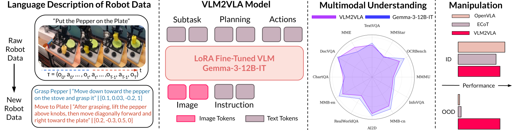 Through extensive Visual Question Answering (VQA) studies and over 800 real-world robotics experiments, we demonstrate that VLM2VLA preserves the VLM's core capabilities, enabling zero-shot generalization to novel tasks that require open-world semantic reasoning and multilingual instruction following.